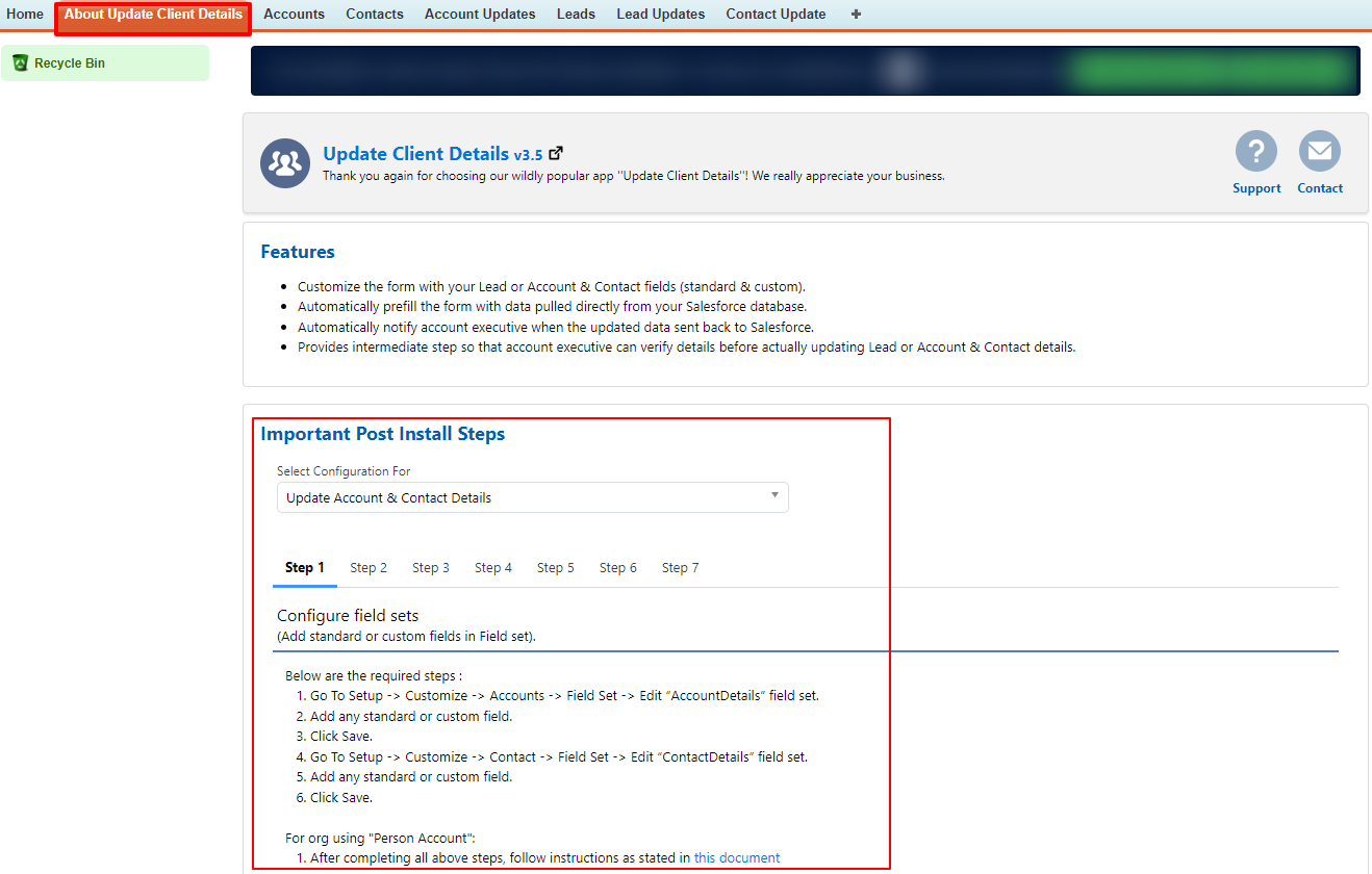After installing the app, the Salesforce Admin User must perform the required configuration steps mentioned in the Configuration Guide for Account and Related Contacts Form and perform the important post-install steps mentioned on the About Update Client Details tab.