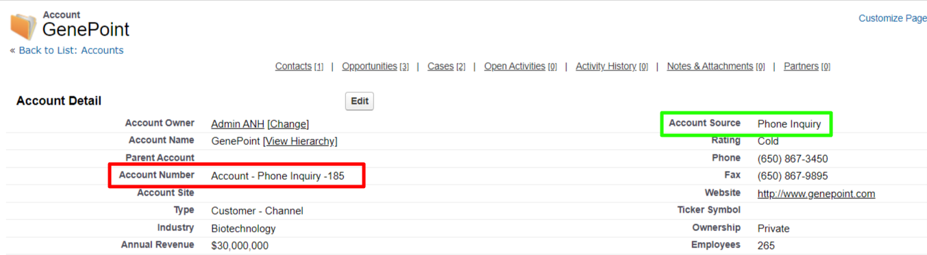 1. Account Object - In the below image you can see the "Account Source" field value is stamped on the "Account Number" field as this is configured by the Auto Number Helper App.
