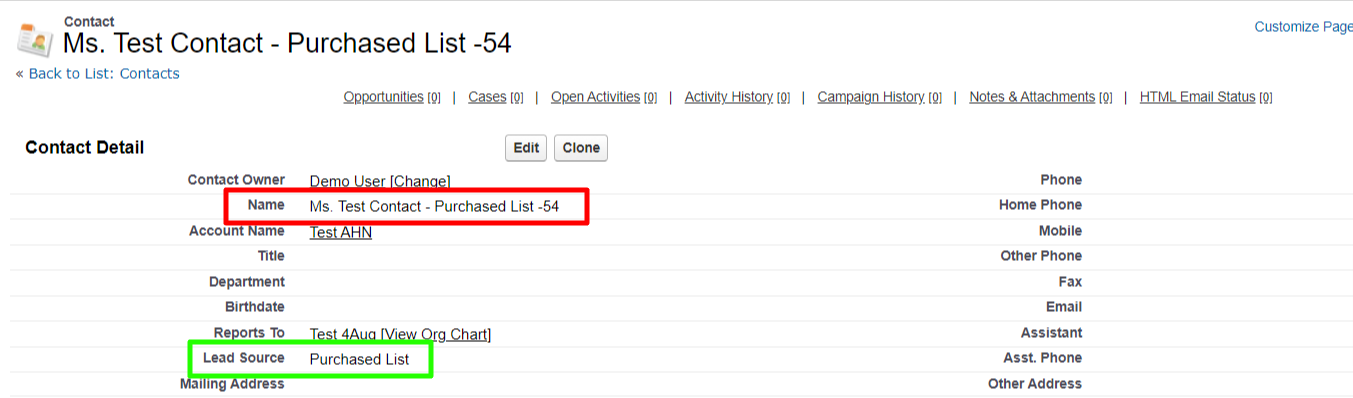 2. Contact Object - In the below image you can see the "Lead Source" field value is stamped on the "Name" field as this is configured by the Auto Number Helper App.