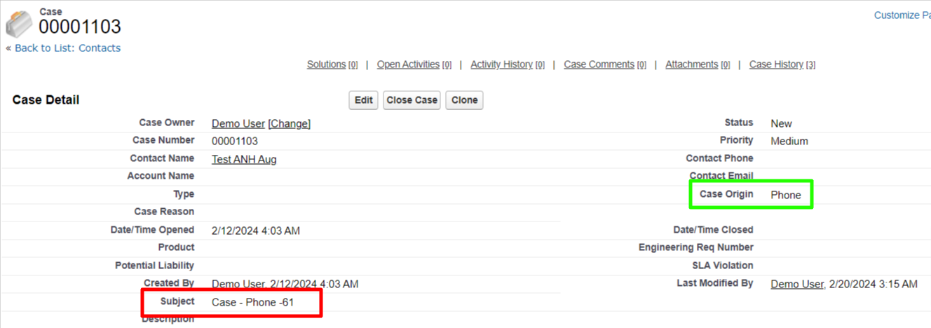 3. Case Object - In the below image you can see the "Case Origin" field value is stamped on the "Subject" field as this is configured by the Auto Number Helper App.