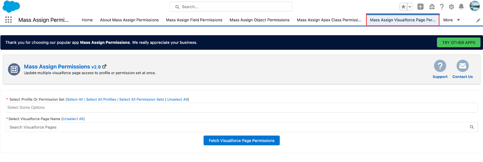 - Go to Mass Assign Visualforce Page Permissions Tab n the Mass Assign Permissions app.