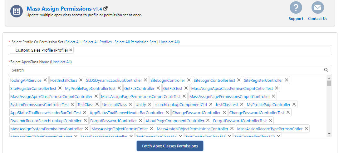 - The following table will be displayed after clicking the "Fetch Apex Class Permissions" button, showing the permissions of Apex Classes assigned to the selected profile. The user can edit it and save it to assign permissions to the respective profile.