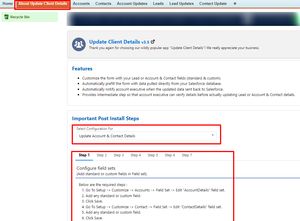 To configure the Update Client Details app on your Account record, start with choosing Update Account & Contact Details in the drop-down of "Select Configuration For" under Important Post Install Steps on the About Update Client Details tab and perform the following steps stated there. (Refer to the below screenshot).