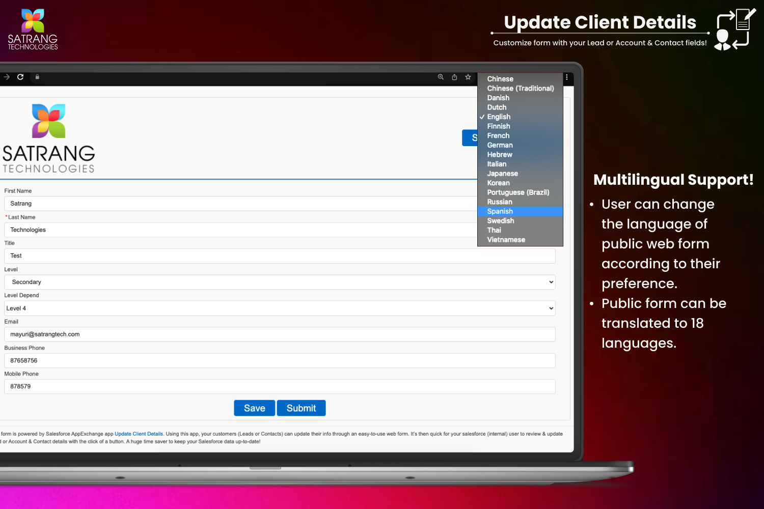 Use this document - Multi-Language Support to configure the multi-language support for the Update Client Details app in your Salesforce org.