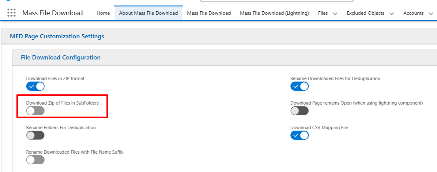 2- Scroll down to File Download Configuration section and turn off the Download Zip of Files in Subfolders toggle.