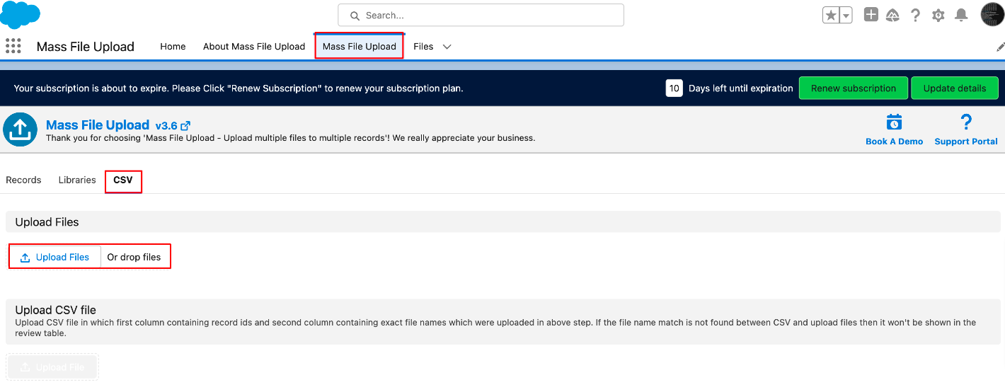 Upload the CSV file you've prepared to the "Mass File Upload" application. This file should contain the "Id" and "File Name" columns, with the respective record IDs and file names.