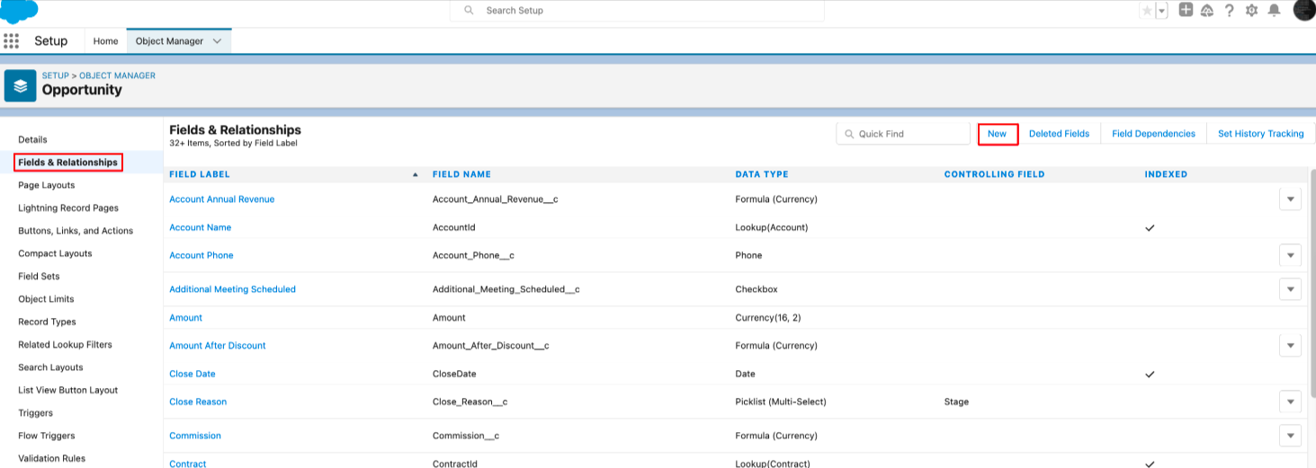 - Click on Fields & Relationships and then select New to create a new field.