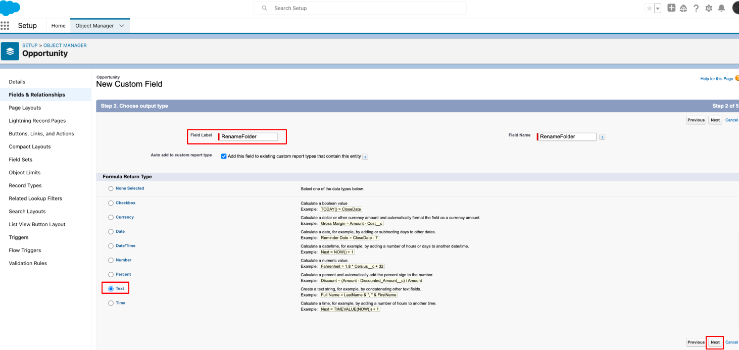 - Select the formula type as Text set a field name, and click Next.