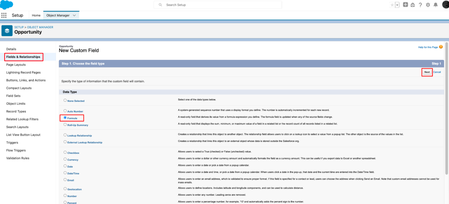 - Click Next and then click Save to create the formula field.