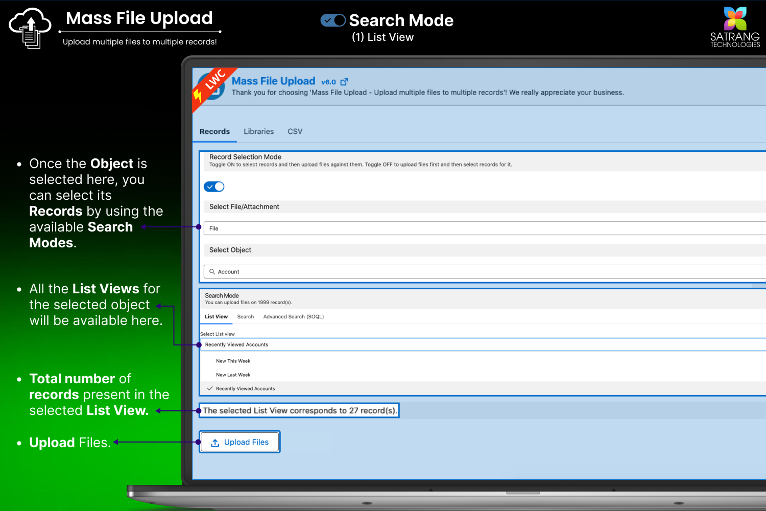 Yes. You have to select the object first. Once the object is selected, all the list views for that object will be displayed in a "Select Mode" - "List View" drop-down list. Once you select any List View, all the records in that list view will be selected, and all the files that you upload (Single or Multiple) will be uploaded/linked to all the records in the selected list view.