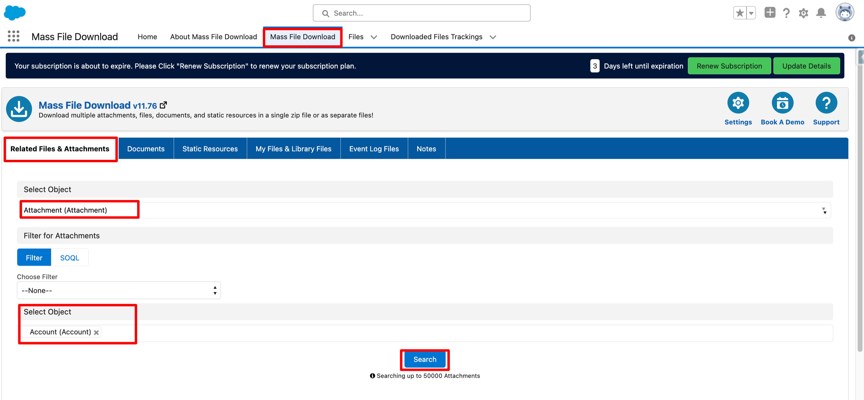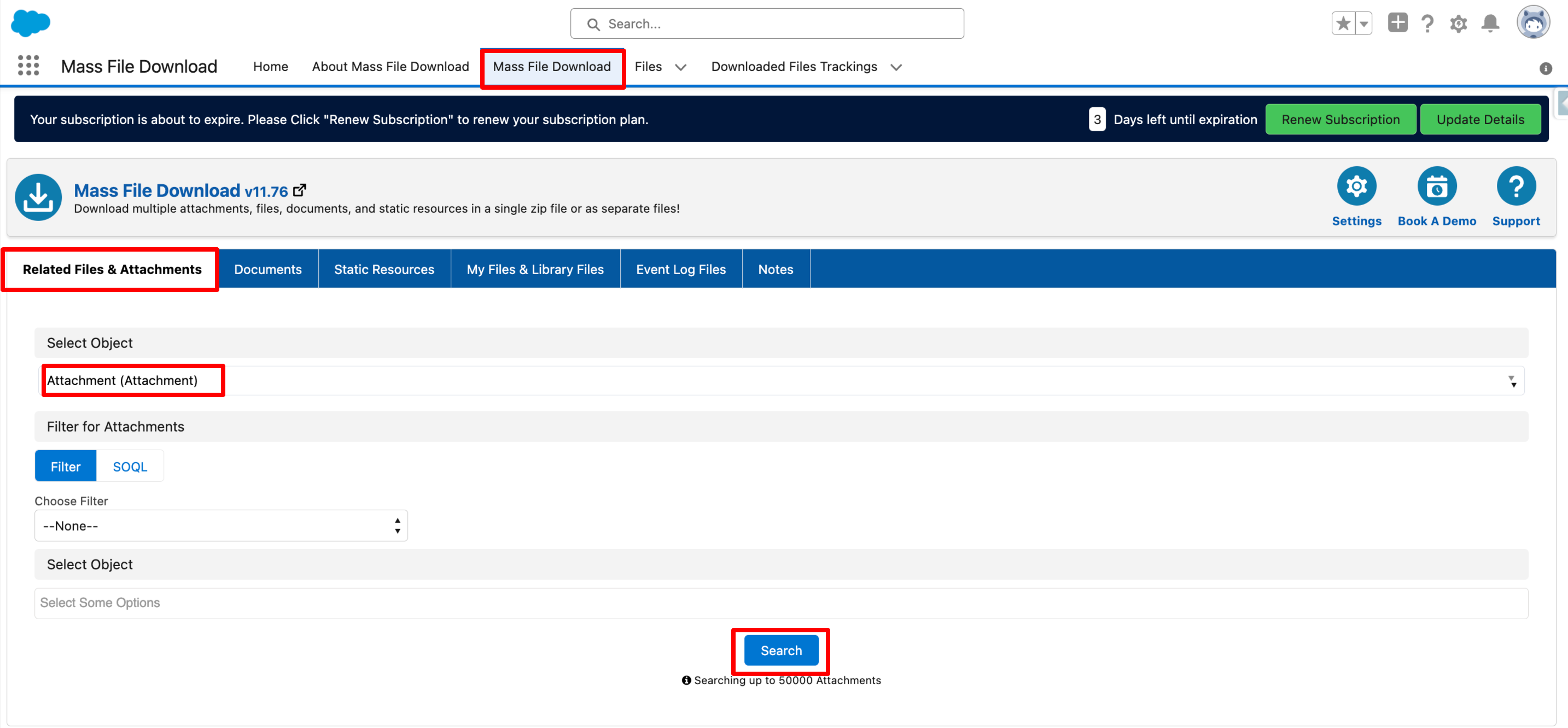 - Under the "Related Files & Attachments" subtab select the Object as "Attachment" and click on the "Search" button.
