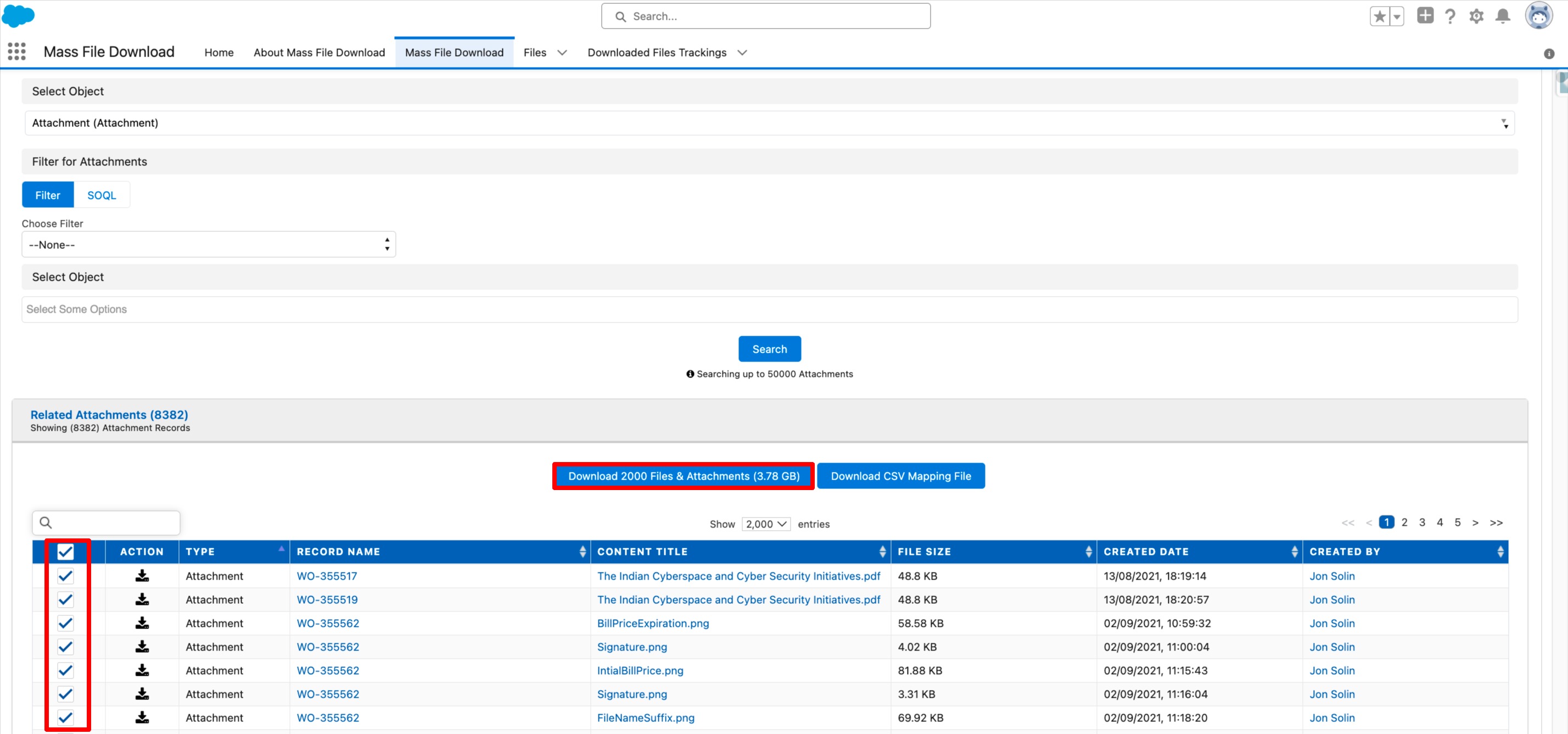 - A table with a list of each attachment for the selected object will show up. To download all of the selected attachments at once, check the box next to each attachment, then click the "Download Files & Attachments" button.