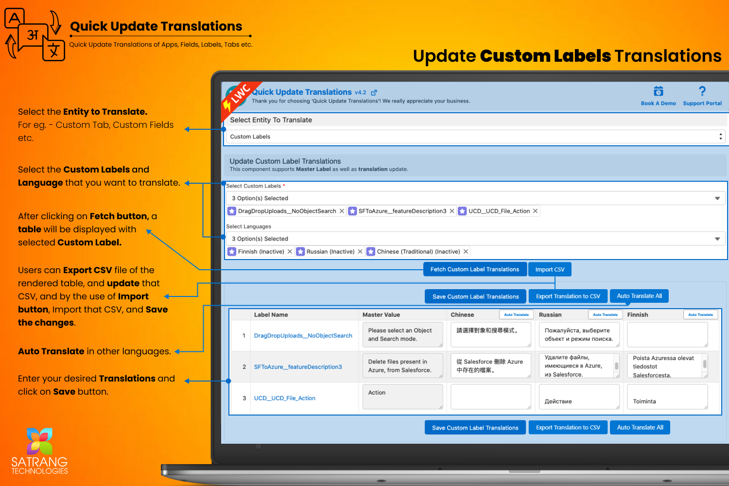 - The page will display a table with the selected labels and languages. You can update the translations directly in this table.