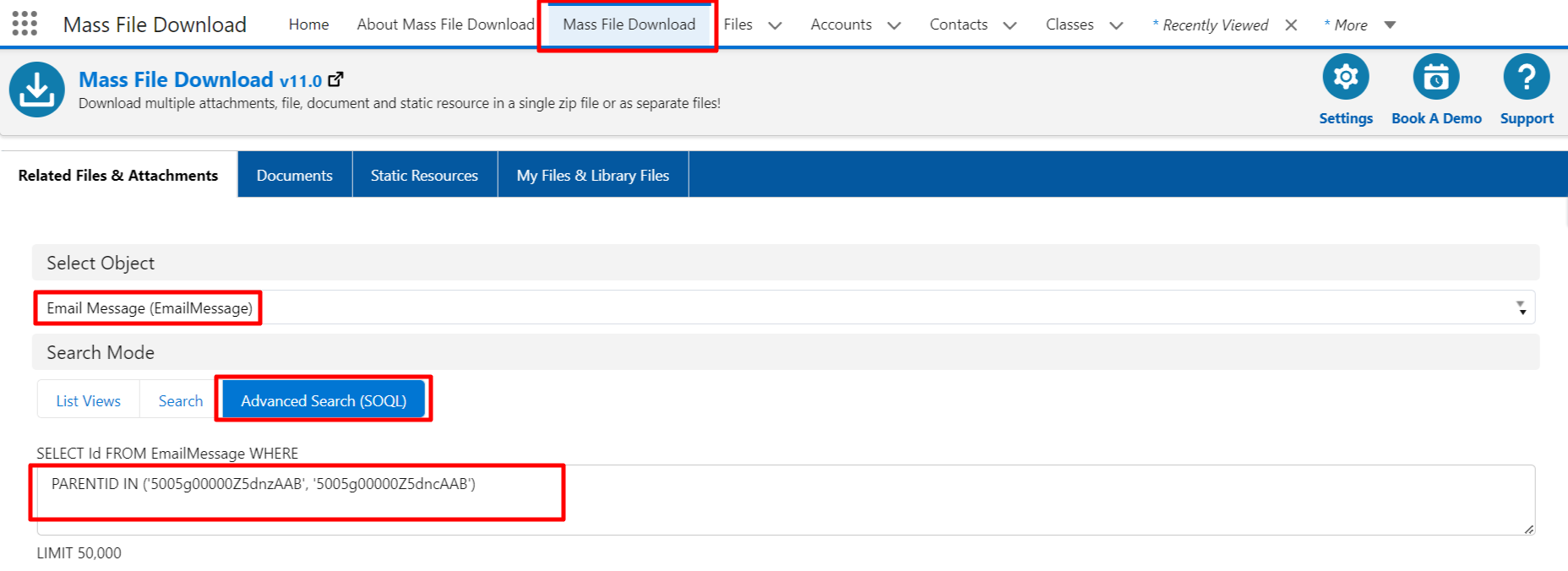3. In Search Mode Select "Advanced Search (SOQL)" and enter the Quarry, Here you need to add Case record IDs.