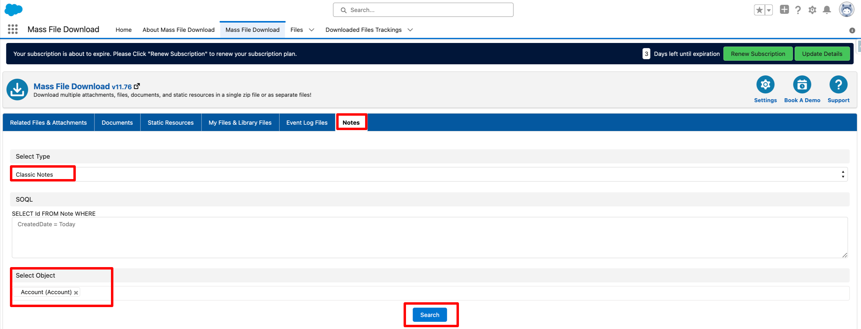 - Under the "Notes" subtab select the Type as "Classic Notes" and click on the "Search" button.