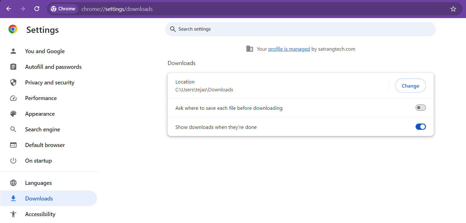 - Click Ask where to save each file before downloading to manually select the location each time you download a file.