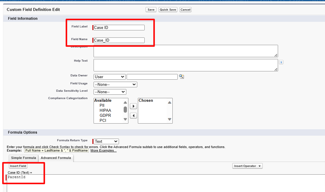 a) Field Label - Case ID
