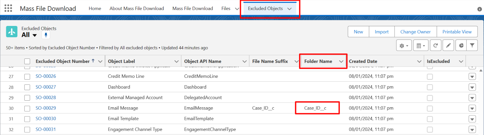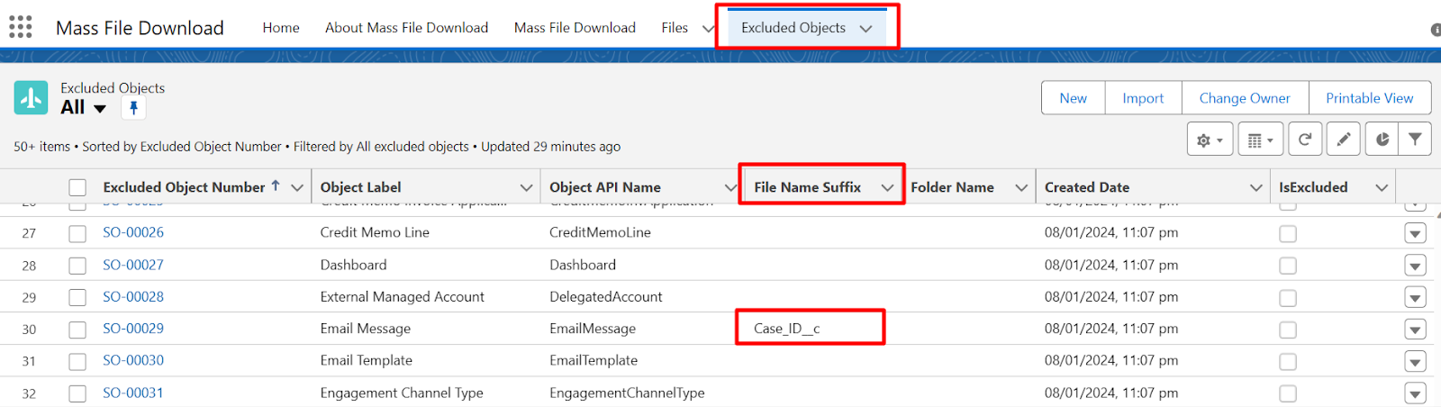 - On the Excluded Object tab, choose the All List view --> Search for the Email Message and edit the File Name Suffix as Case_ID__c API Name of the above-created (formula field) as shown in the below image.