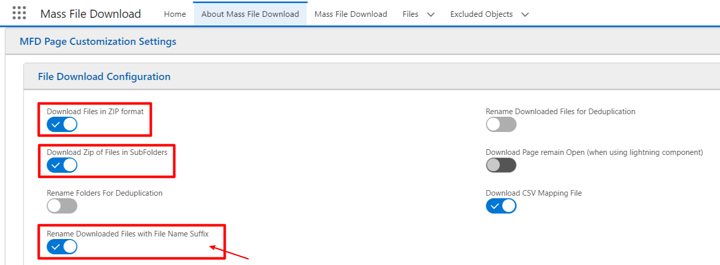 - Turn ON the Download Files in ZIP format, 'Download Zip of Files in SubFolders, and "Rename Downloaded Files with File Name Suffix" Toggles and hit the "Save" Button.