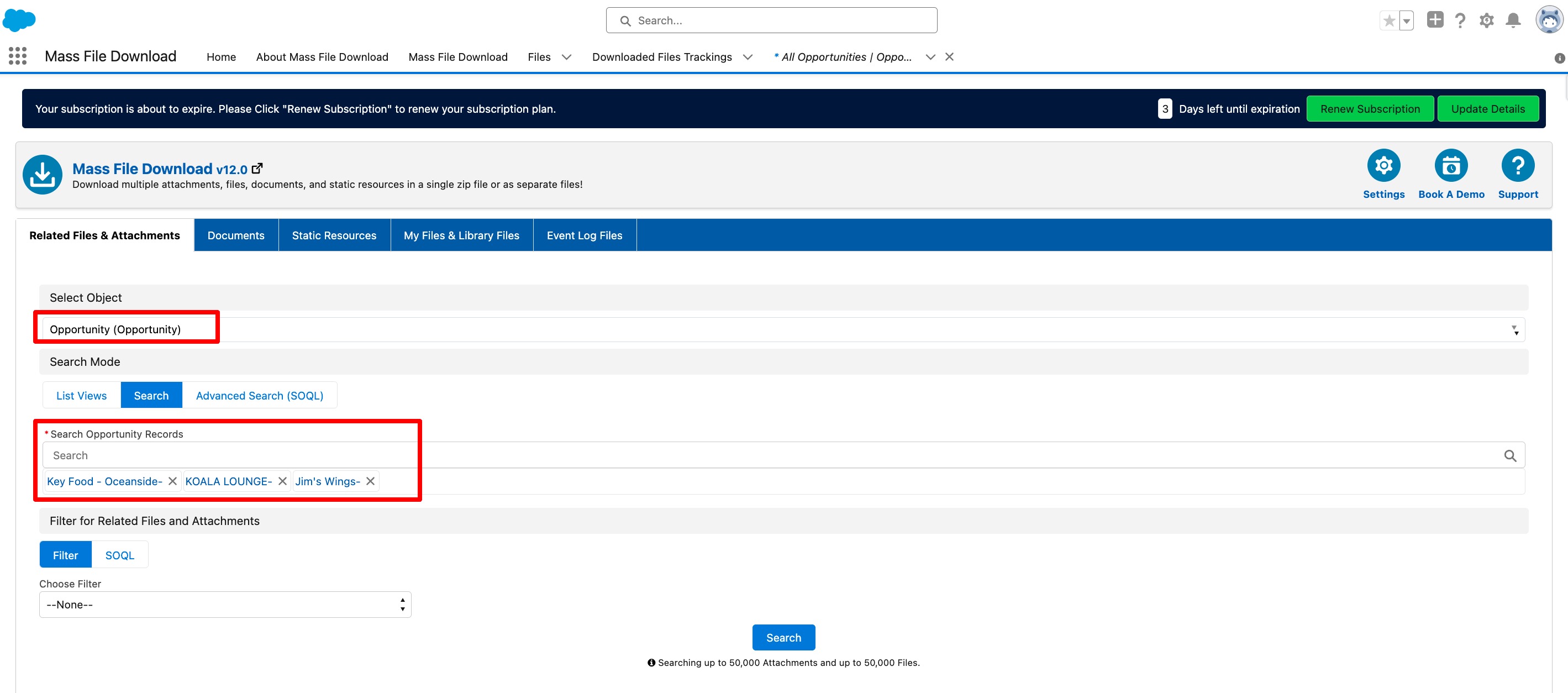 - If you select specific records and then click on the List View Button, it will redirect you to the Mass File Download Page with preselected Object and records in Search Mode.