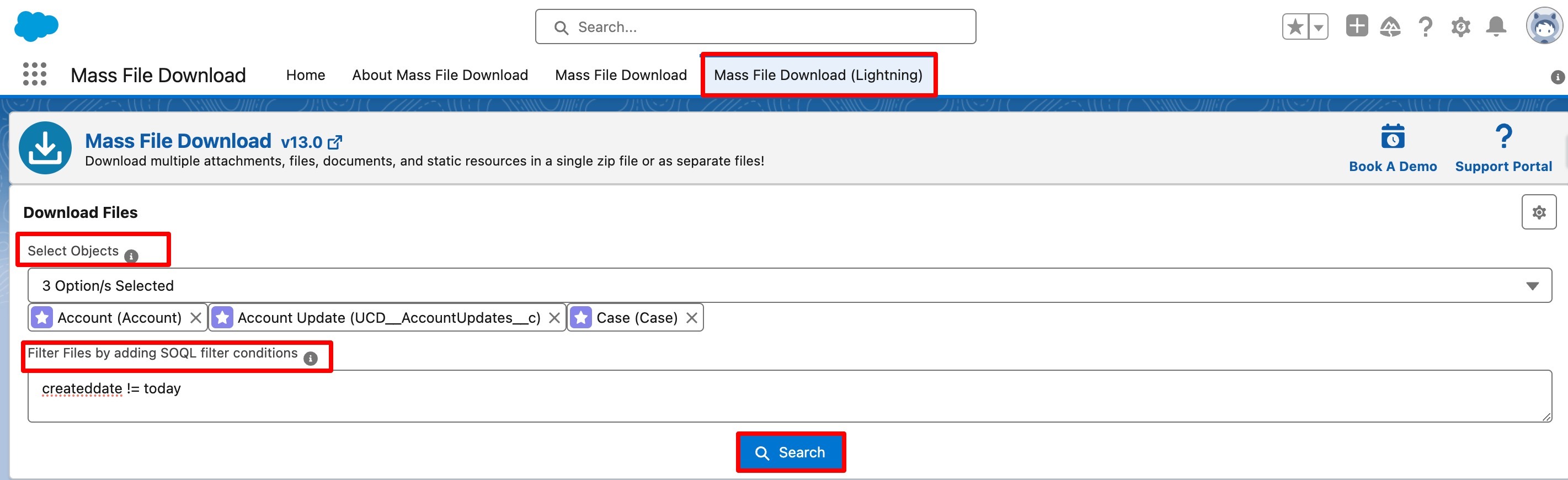 - Optionally, you can filter files by adding SOQL filter conditions. Add the SOQL if you want to filter the files, then click on the "Search" button.