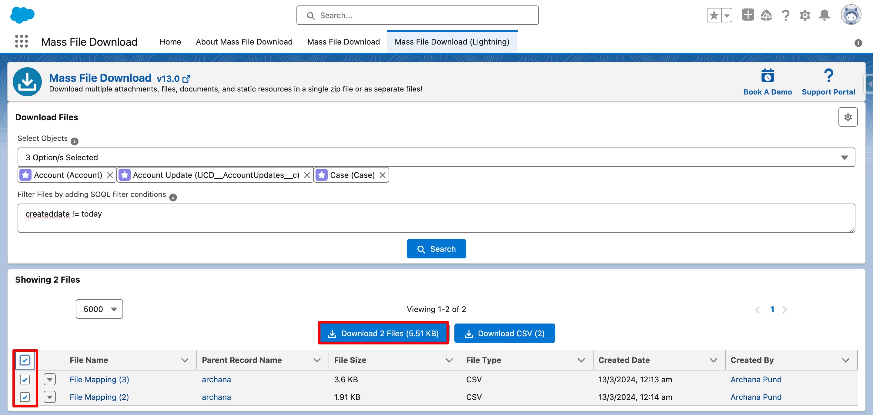 - Go to the Mass File Download app and select the "Mass File Download (Lightning)" Tab.