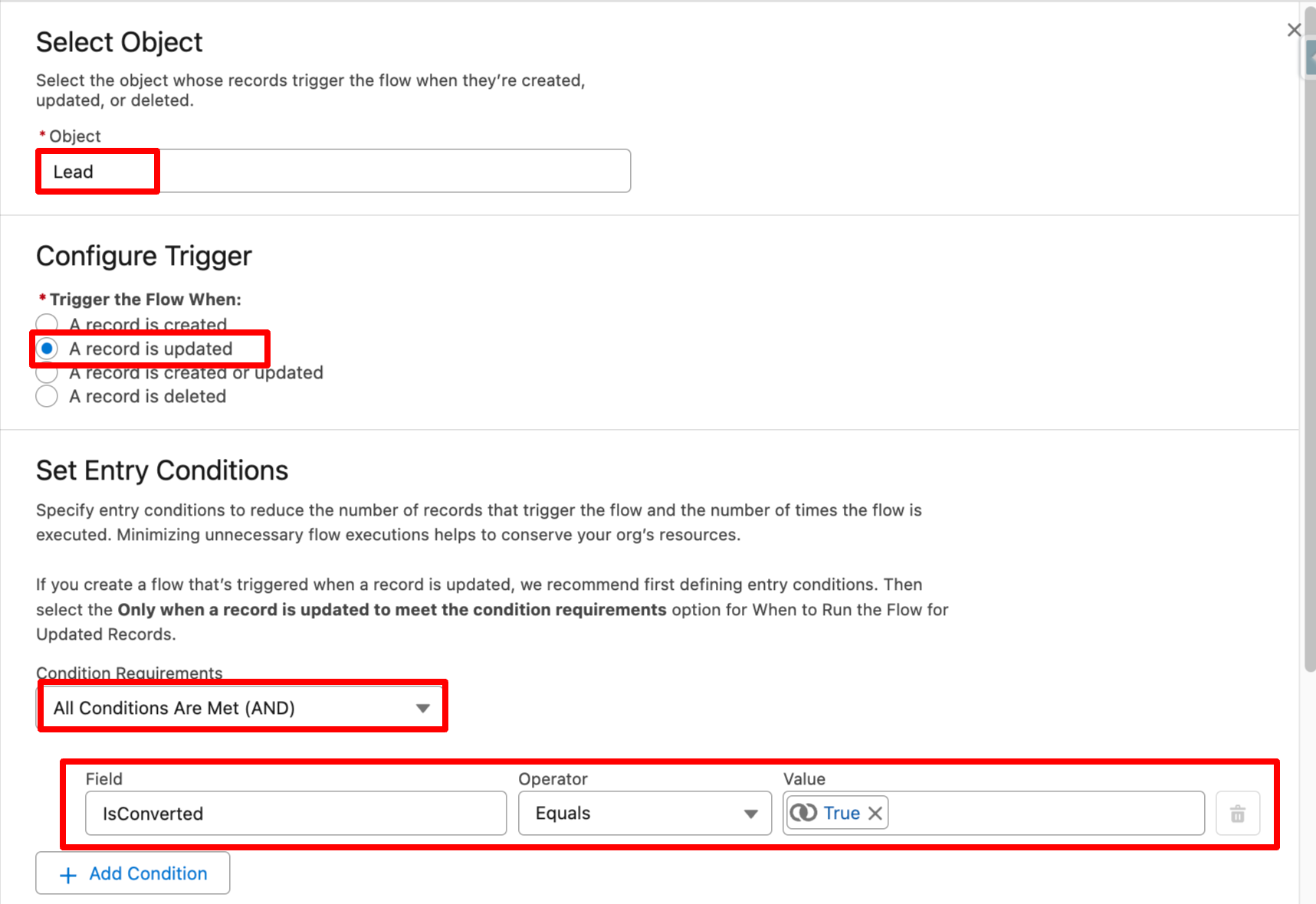 - Set entry conditions to: All conditions are Met, IsConverted = TRUE.