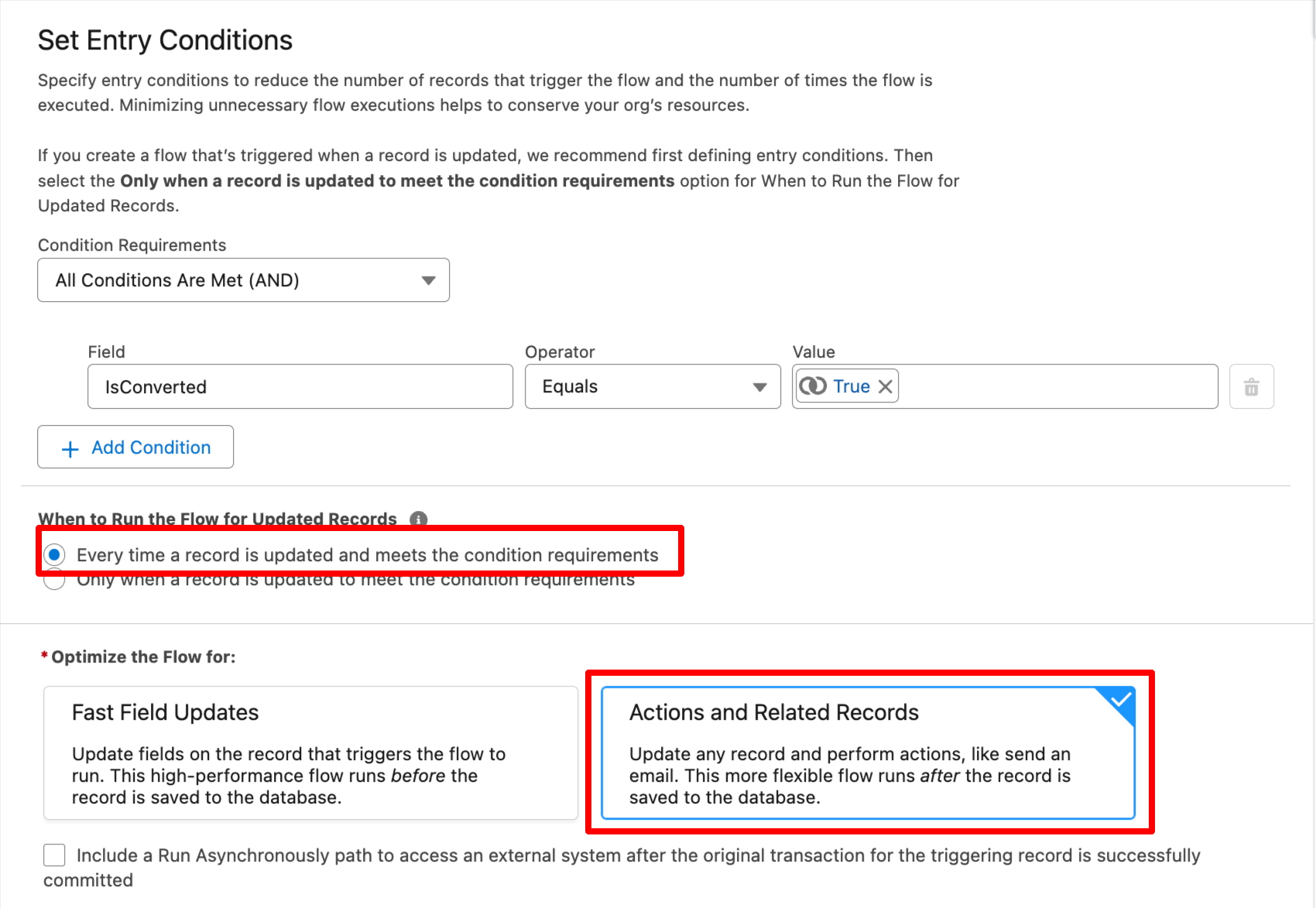 - For "When to Run the Flow for Updated Records", choose "Every time a record is updated and meets the condition requirements."