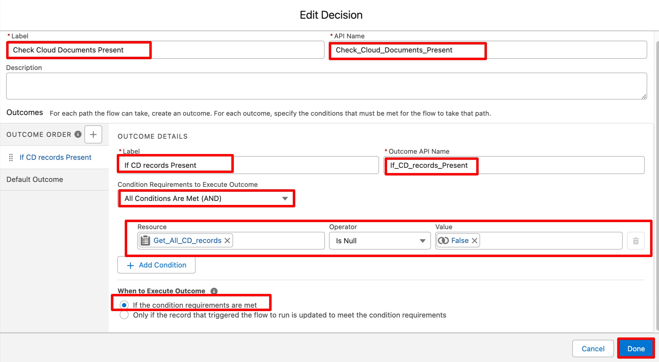 - For Condition Requirement to Execute outcome select All Conditions are Met(AND)