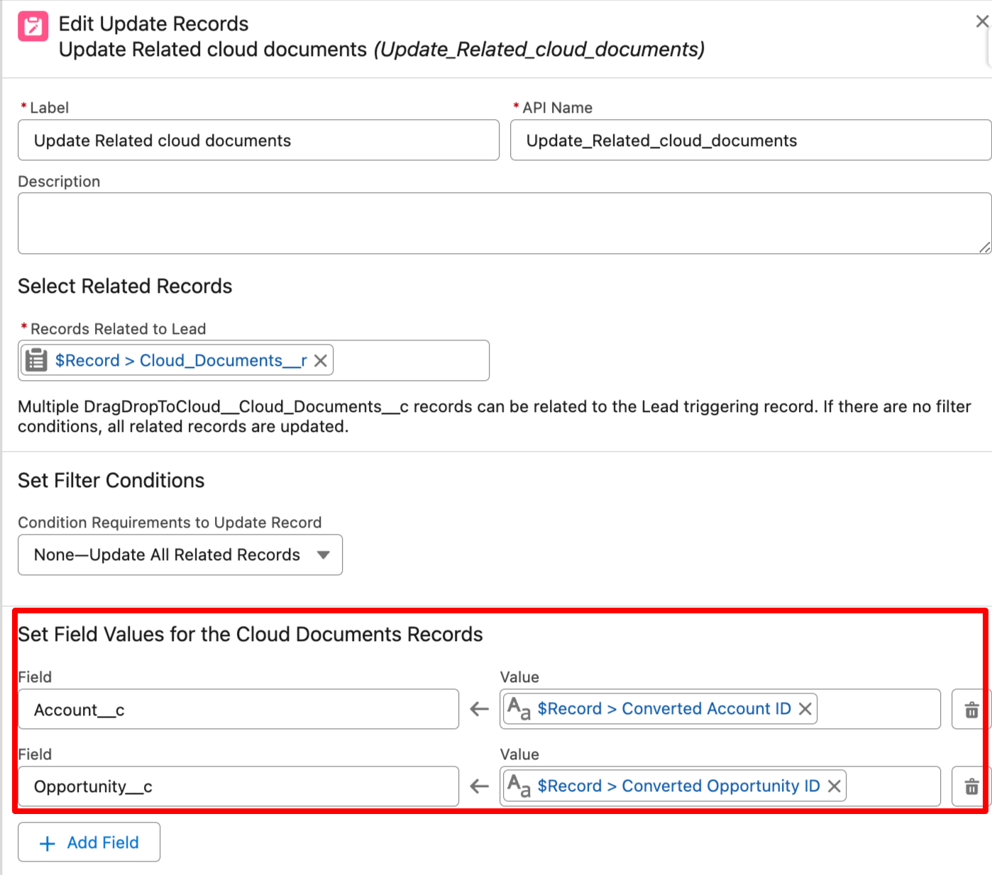 - Set Field Values for the Cloud Documents Records - Set below 2 fields: