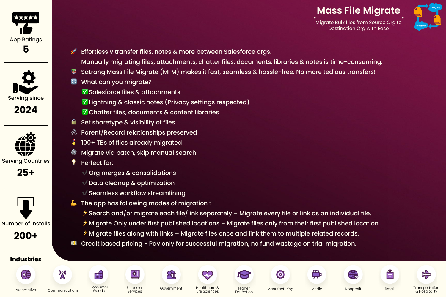 Mass File Migrate simplifies the file migration process by allowing users to select multiple files and migrate them to a new Salesforce org with just a few clicks. Users can specify the destination org from the source org, apply filters if needed, and initiate the migration process seamlessly.