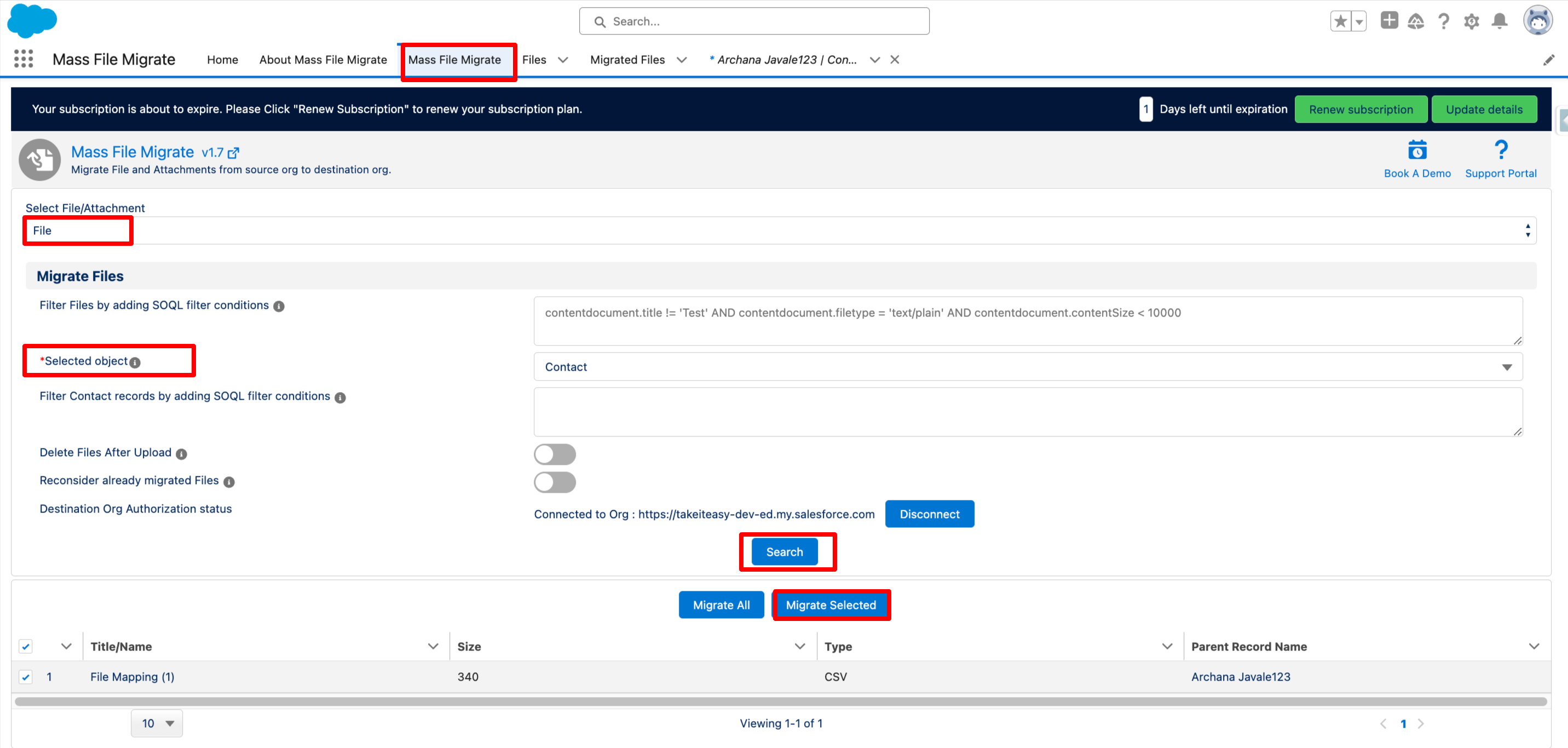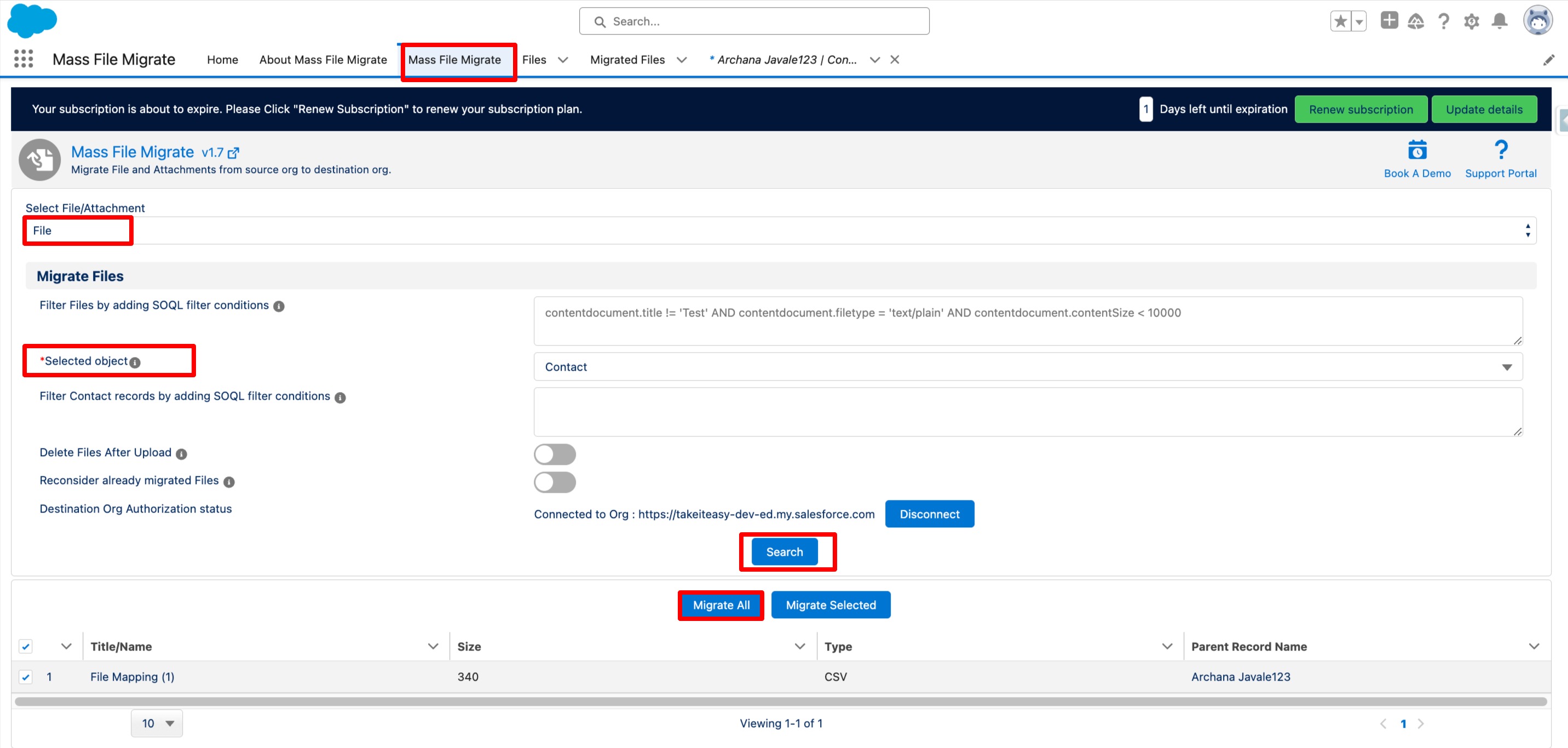 - Select the object from which you want to migrate files and click on the "Search" button.