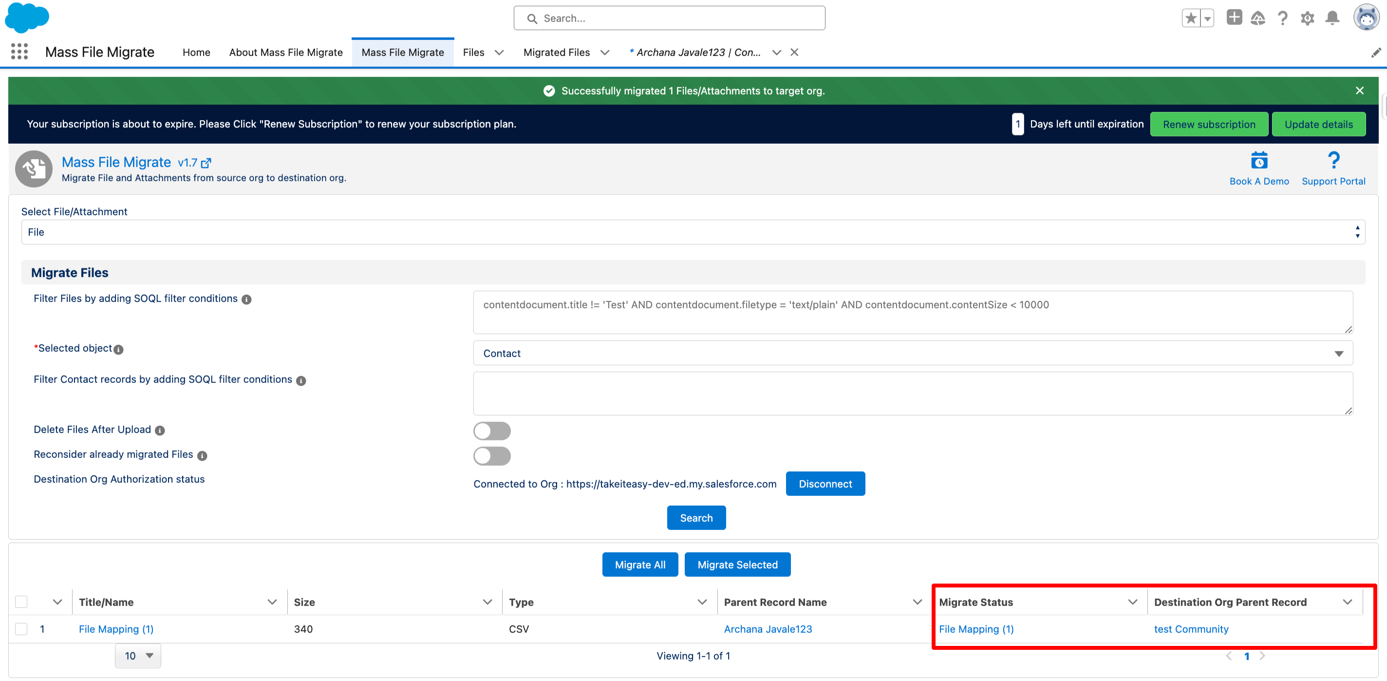- Upon successful migration, you will receive a success message on the screen, and in the table, you can check the "Migrate Status" and "Destination Org Parent Record".