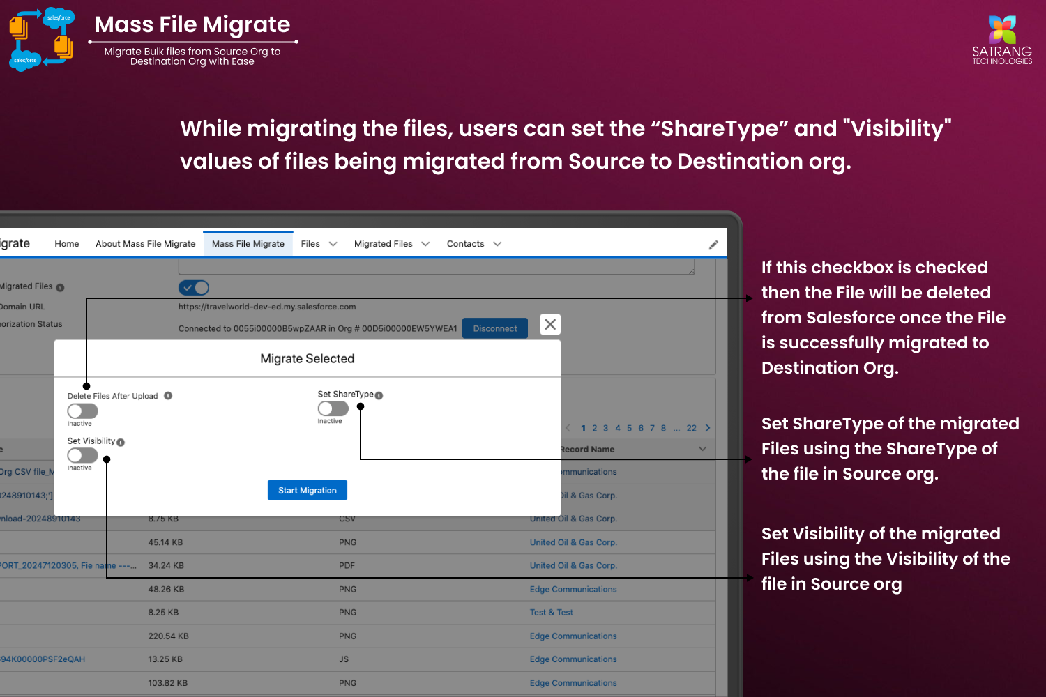 You can set the ShareType and Visibility values for files being migrated from the Source to the Destination org. Simply toggle the settings while using any of the migration options: Migrate Selected, Migrate All, or Migrate Via Batch. Please note that this option is only available for Files (ContentVersion).