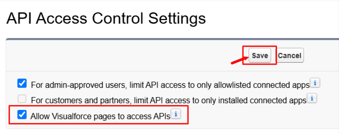 4. Check the Allow Visualforce pages to access APIs checkbox and click Save.