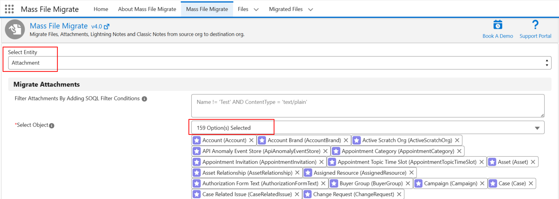 No, there is no limit—you can select all objects at once for attachment migration. For example, as shown in the screenshot below, 159 objects have been selected in a single migration session.