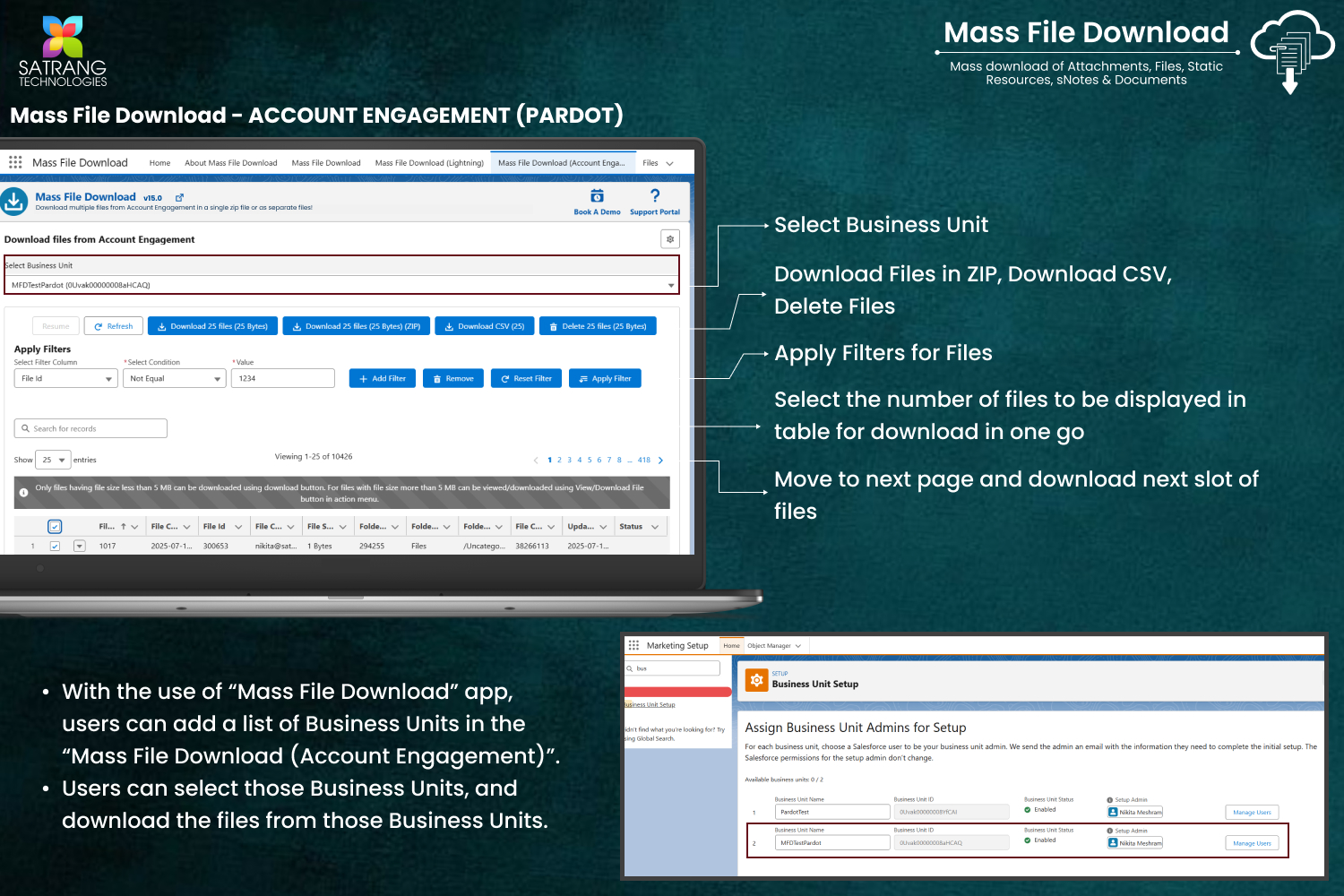 This feature allows you to download files from Account Engagement (Pardot) across multiple business units. You can download files individually or in bulk as a ZIP, and you also have the option to delete files after downloading. If you want, you can apply multiple filter conditions to narrow down your file selection. There is no need to install the Mass File Download app in the Pardot org—simply complete the configuration and add the desired business units in the Mass File Download (Account Engagement) tab, where the Mass File Download app is installed. From there, you can view and download files directly from that org.