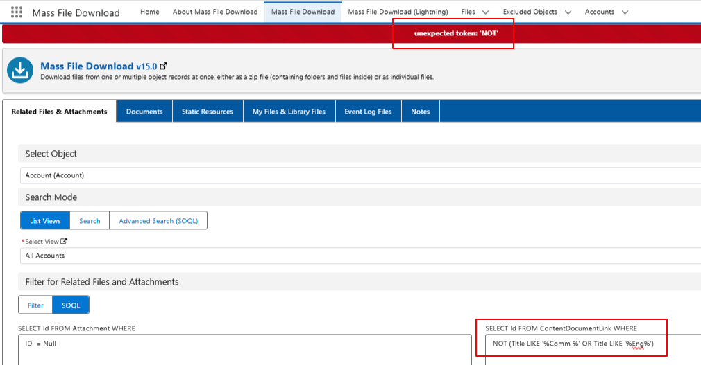 This error occurs when a NOT condition in your query isn’t properly enclosed in parentheses. Simply adding the field directly (like Title) without parentheses will not work. To fix the issue, enclose the NOT condition in parentheses.