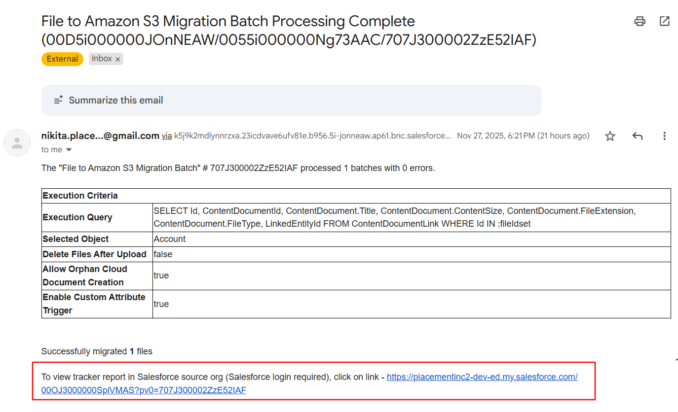The email provides a direct link to the Tracker Report in Salesforce, where you can view detailed migration logs (Salesforce login required).