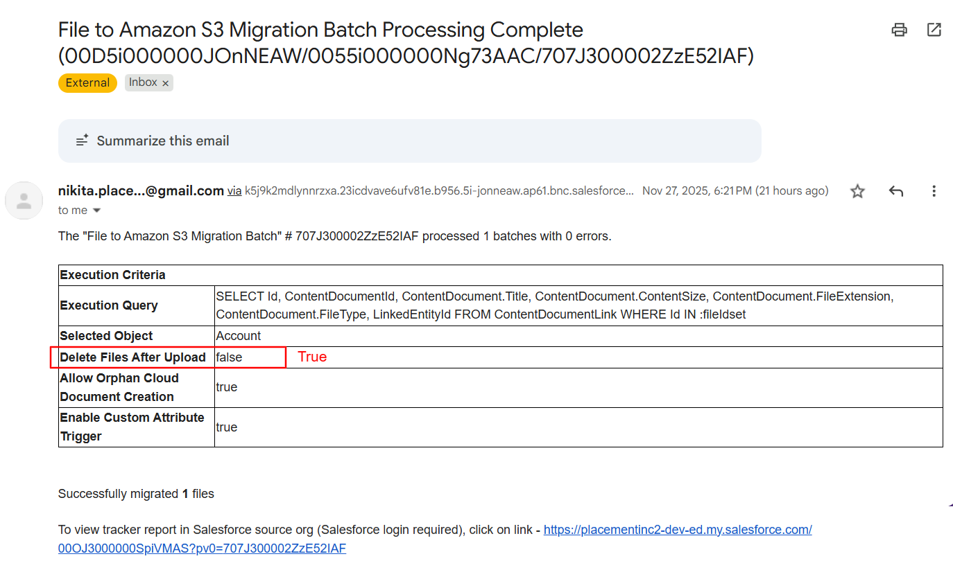 The email includes the Delete Files After Upload value so you can verify if files were supposed to be removed from Salesforce after migration.