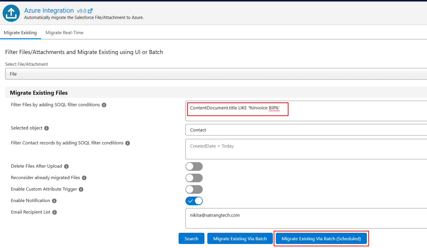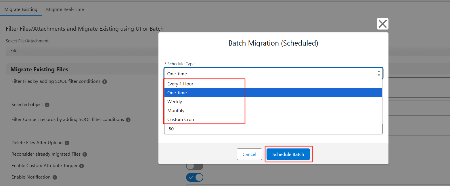 The Scheduled Migration feature allows admin users to schedule the migration of Files/Attachments on demand directly from the Migrate Existing screen. Files that meet the selected filter criteria are automatically migrated based on the chosen schedule.