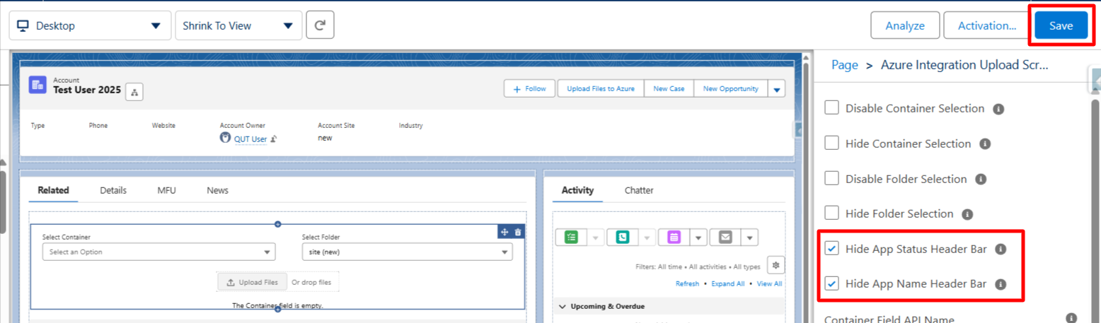 - Remove the existing component and add the Azure Integration Upload Screen component.