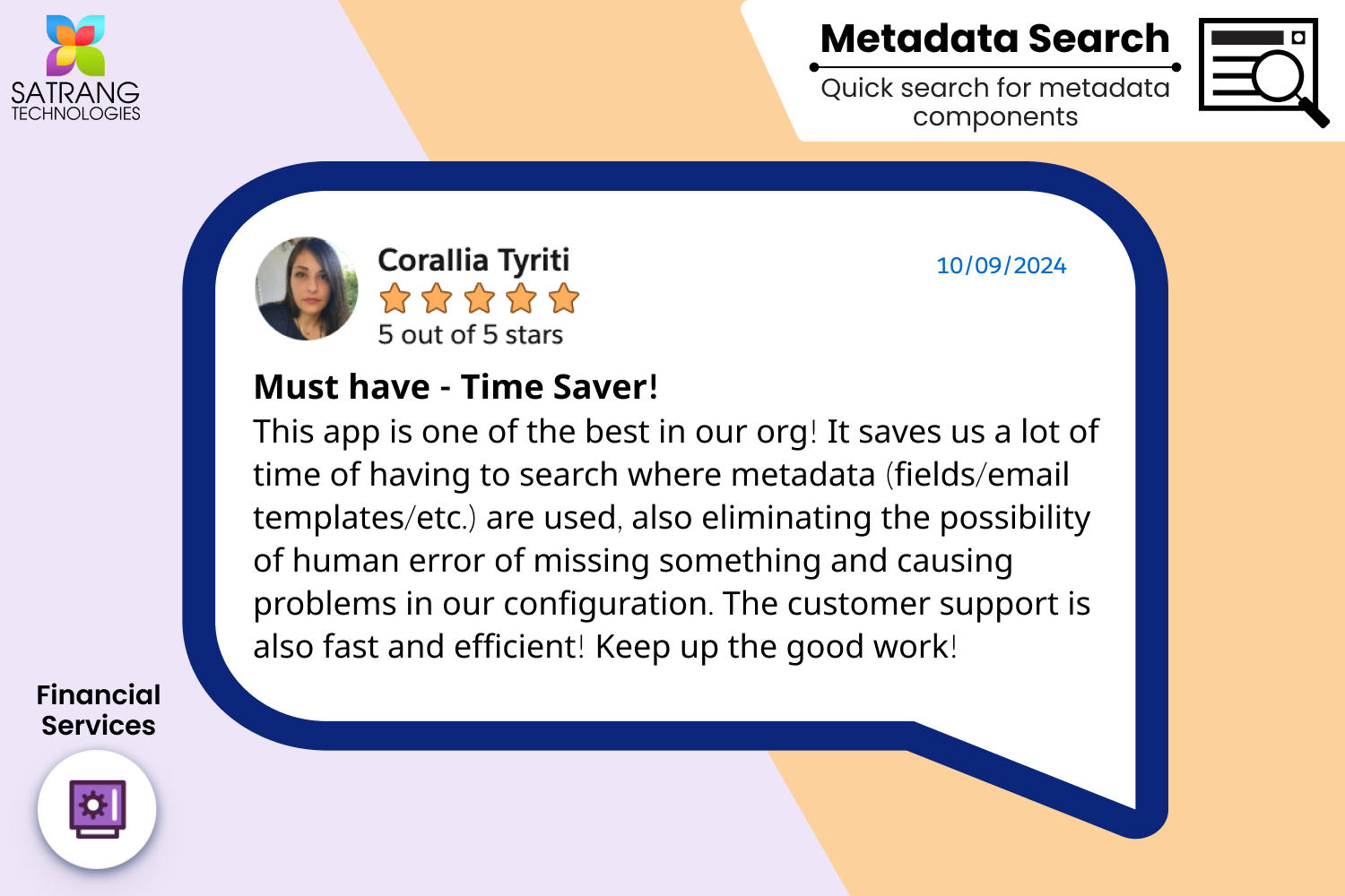 This app is one of the best in our org! It saves us a lot of time of having to search where metadata (fields/email templates/etc.) are used, also eliminating the possibility of human error of missing something and causing problems in our configuration. The customer support is also fast and efficient! Keep up the good work!