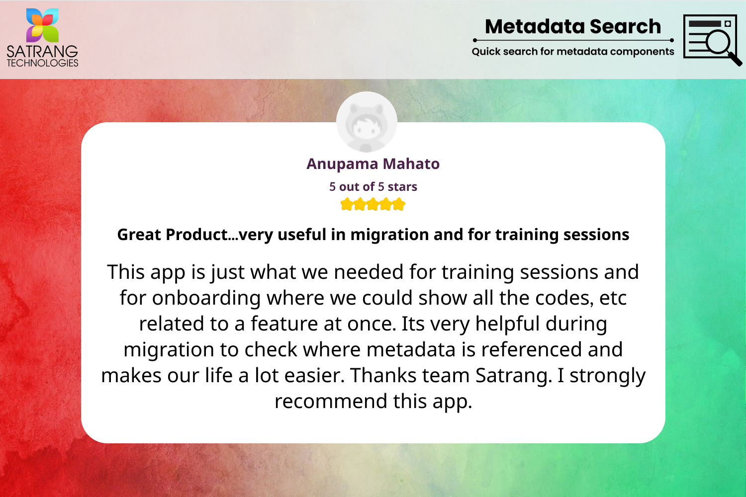 This app is just what we needed for training sessions and for onboarding where we could show all the codes, etc related to a feature at once. Its very helpful during migration to check where metadata is referenced and makes our life a lot easier. Thanks team Satrang. I strongly recommend this app.
