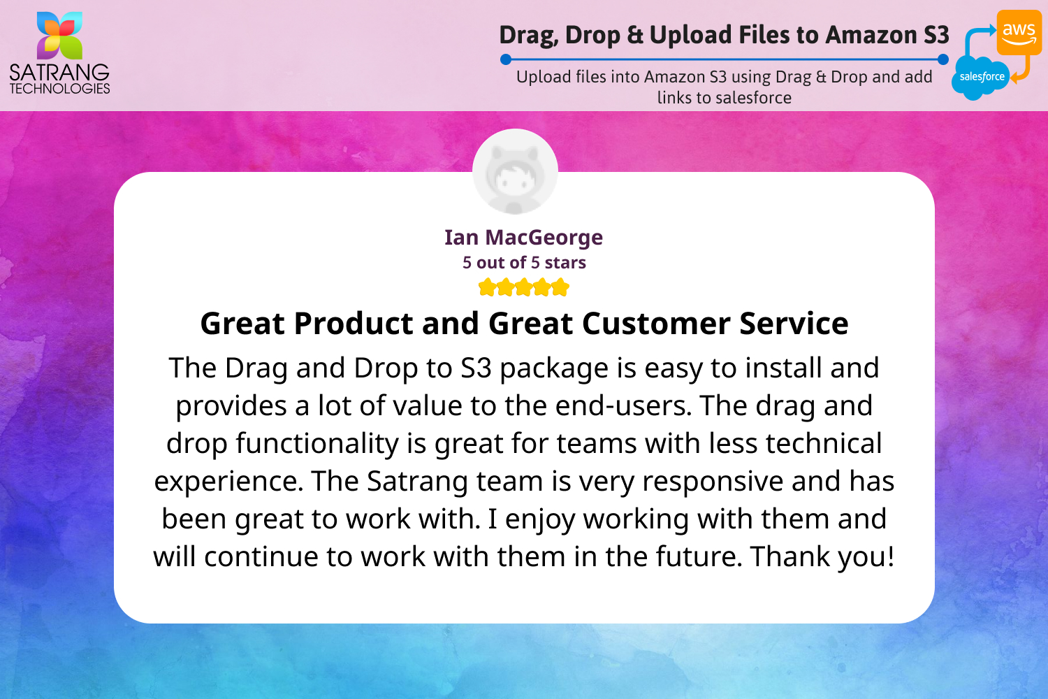 The Drag and Drop to S3 package is easy to install and provides a lot of value to the end-users. The drag and drop functionality is great for teams with less technical experience. The Satrang team is very responsive and has been great to work with. I enjoy working with them and will continue to work with them in the future. Thank you!