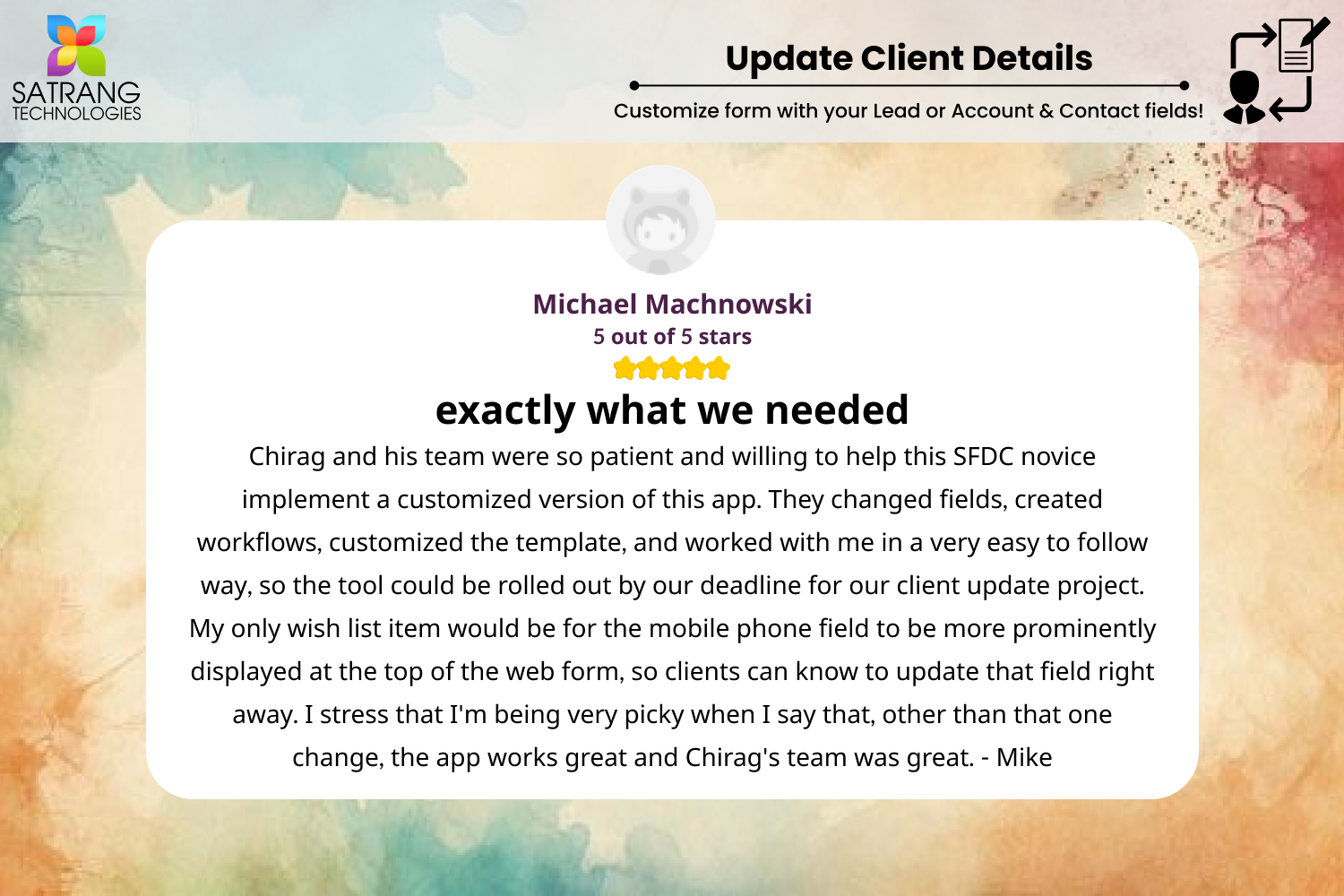 Chirag and his team were so patient and willing to help this SFDC novice implement a customized version of this app. They changed fields, created workflows, customized the template, and worked with me in a very easy to follow way, so the tool could be rolled out by our deadline for our client update project. My only wish list item would be for the mobile phone field to be more prominently displayed at the top of the web form, so clients can know to update that field right away. I stress that I'm being very picky when I say that, other than that one change, the app works great and Chirag's team was great. - Mike