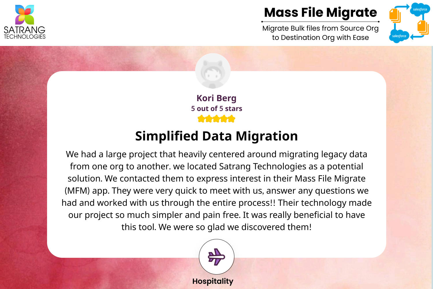 We had a large project that heavily centered around migrating legacy data from one org to another. we located Satrang Technologies as a potential solution. We contacted them to express interest in their Mass File Migrate (MFM) app. They were very quick to meet with us, answer any questions we had and worked with us through the entire process!! Their technology made our project so much simpler and pain free. It was really beneficial to have this tool. We were so glad we discovered them!