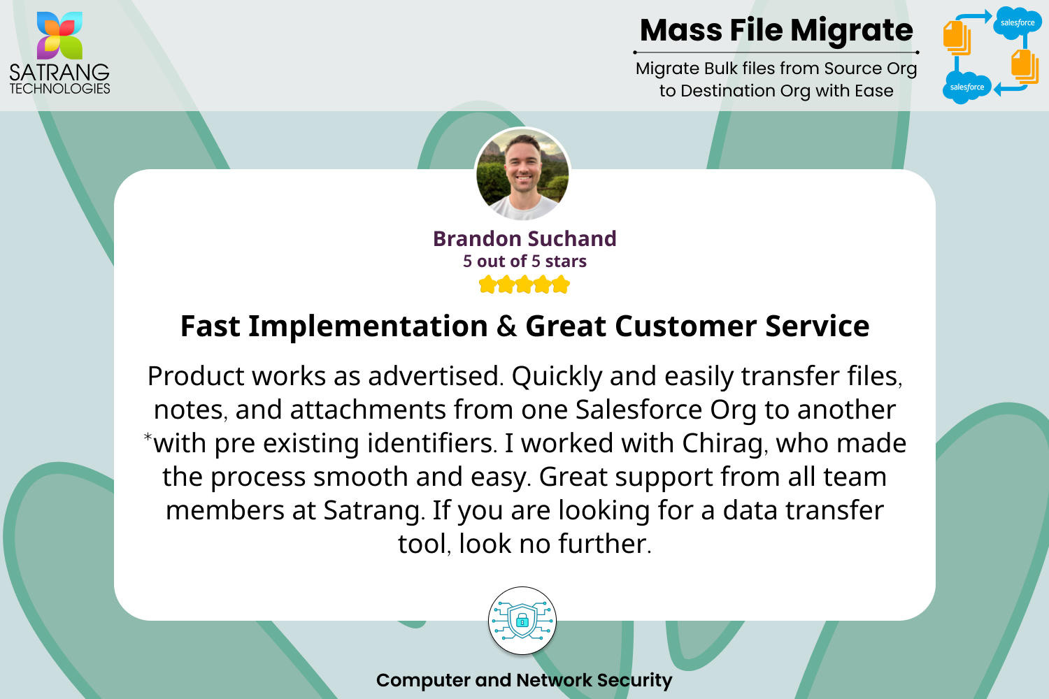 Product works as advertised. Quickly and easily transfer files, notes, and attachments from one Salesforce Org to another *with pre existing identifiers. I worked with Chirag, who made the process smooth and easy. Great support from all team members at Satrang. If you are looking for a data transfer tool, look no further.