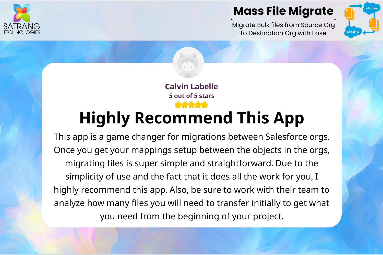 This app is a game changer for migrations between Salesforce orgs. Once you get your mappings setup between the objects in the orgs, migrating files is super simple and straightforward. Due to the simplicity of use and the fact that it does all the work for you, I highly recommend this app. Also, be sure to work with their team to analyze how many files you will need to transfer initially to get what you need from the beginning of your project.