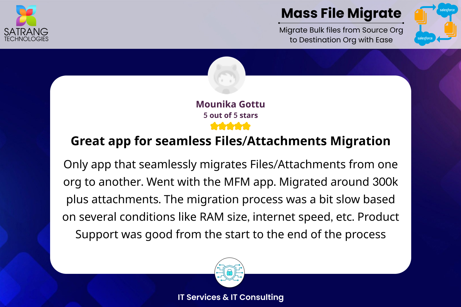 Only app that seamlessly migrates Files/Attachments from one org to another. Went with the MFM app. Migrated around 300k plus attachments. The migration process was a bit slow based on several conditions like RAM size, internet speed, etc. Product Support was good from the start to the end of the process.